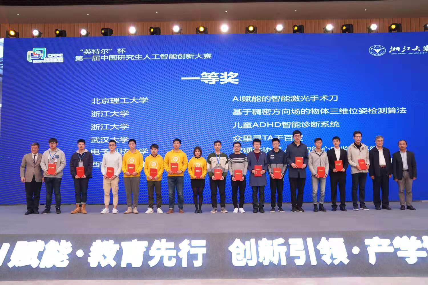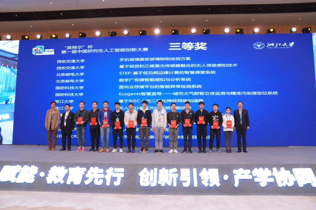 2019年11月22日-25日,由教育部学位与研究生教育发展中心指导、中国科协青少年科技中心主办、浙江大学承办的“英特尔杯”第一届中国研究生人工智能创新大赛全国总决赛在浙江省德清县成功举行。我校获得1项一等奖、2项三等奖、1项优秀指导教师奖和优秀组织奖的佳绩,获奖数量位居全国第二(并列)。