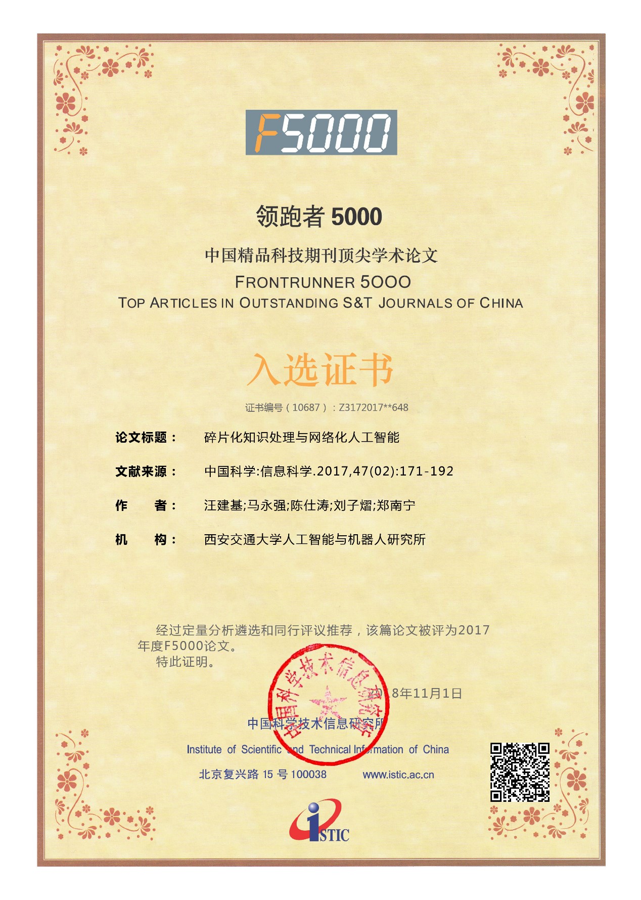 该论文于2017年发表于《中国科学:信息科学》,并入选了2017年度 “领跑者5000——中国精品科技期刊顶尖学术论文”列表。