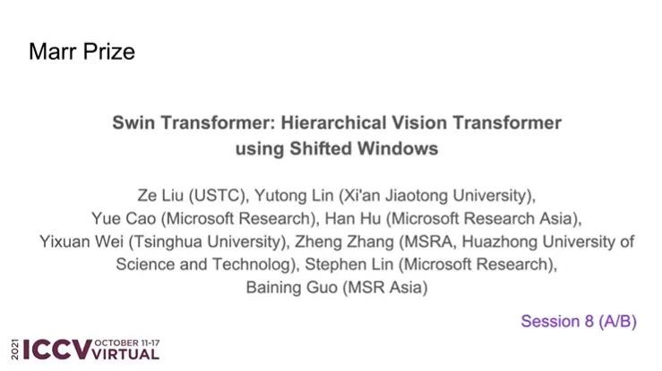 本次ICCV2021的最佳论文奖(马尔奖)颁发给了来自中国科学技术大学的刘泽、禁漫