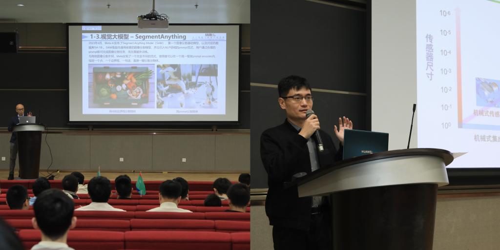 兰旭光教授做了题为《大模型时代机器人自主作业的挑战:行为智能的因果推理与学习》 的精彩报告,介绍了人工智能大模型方面的最新进展,特别是机器人在行为智能方面的进展和面临的挑战,提出了非结构场景下基于视觉推理的机器人自主作业方法,以最优的方式完成特定物体的自主作业。自动化科学与工程学院张靖教授做了题为《基于芯片集成光学微腔的集成微纳传感器》的精彩报告,介绍了芯片集成光学微腔微纳传感器结合过程控制领域的最新进展,涉及基于集成光学微腔传感器的粒子传感、超声传感、磁信号传感、气体传感、温度传感,以及集成光学微腔传感器器件集成封装等前沿技术。