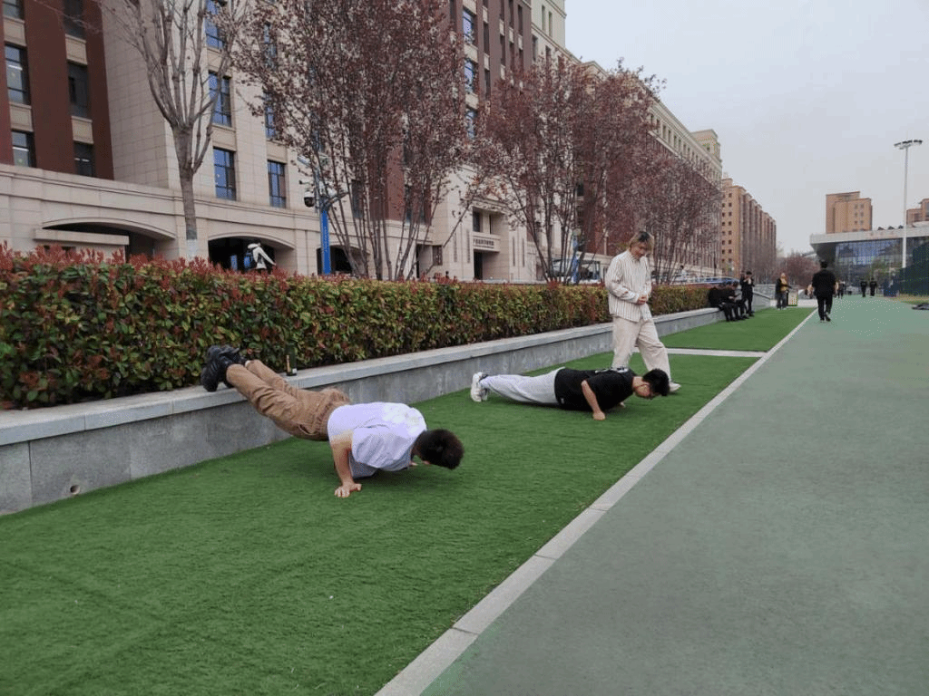 还有同学在操场比赛做俯卧撑、拉单杠,锻炼身体,交流散心,缓解科研的疲惫。