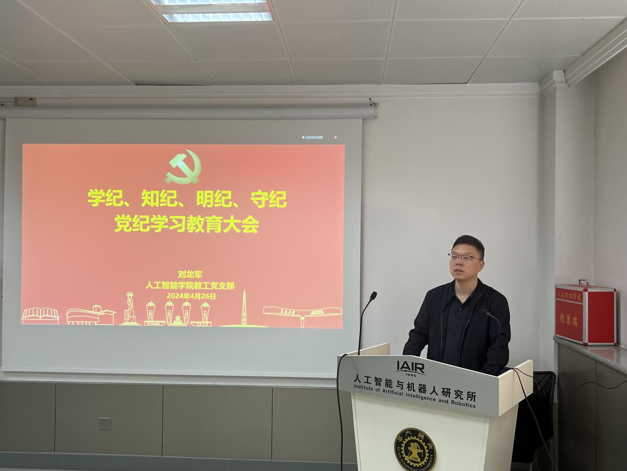 紧接着,为进一步落实习近平总书记关于党纪学习教育的重要讲话和指示精神,教工党支部书记刘龙军副教授引导全体党员深入学习了最新修订的《中国共产党纪律处分条例》。在会议上,刘老师详尽地阐释了党纪学习的要求、核心内容及新条例的关键点,并结合高校相关的警示案例做了深刻分析。他强调,所有与会人员都应将学纪、知纪、明纪、守纪内化为行动准则,牢固树立和践行正确的党纪观念,积极学习、深入理解、明确掌握并严格遵守党纪,以此为学院的稳定发展和各项工作的有序推进提供坚实保障。