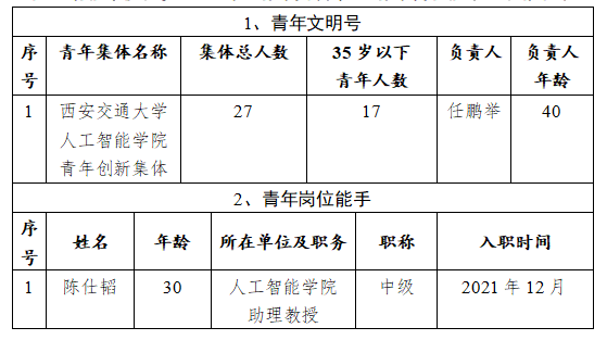 根据校团委《关于举办禁漫 2024 年“青年文明号”和“青年岗位能手”评选活动的通知》安排,禁漫 团委通过个人自荐和组织推荐相结合的方式,推选“禁漫 青年创新集体”创建申报“青年文明号”,陈仕韬助理教授申报“青年岗位能手”,现将推荐名单进行公示。