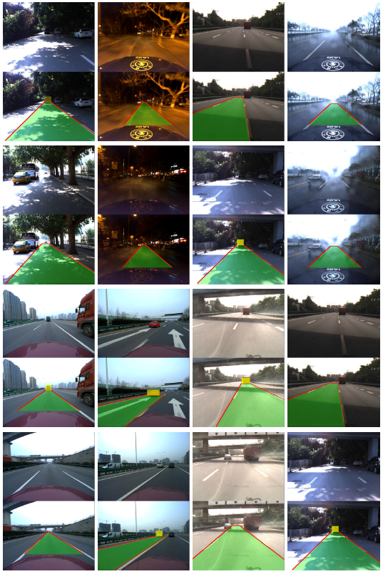 4)人工标记数据:在采集到的图像数据中,我们人工标记了车道线位置,以及场景中障碍车辆位置。数据集中共提供46621张人工标记图片。